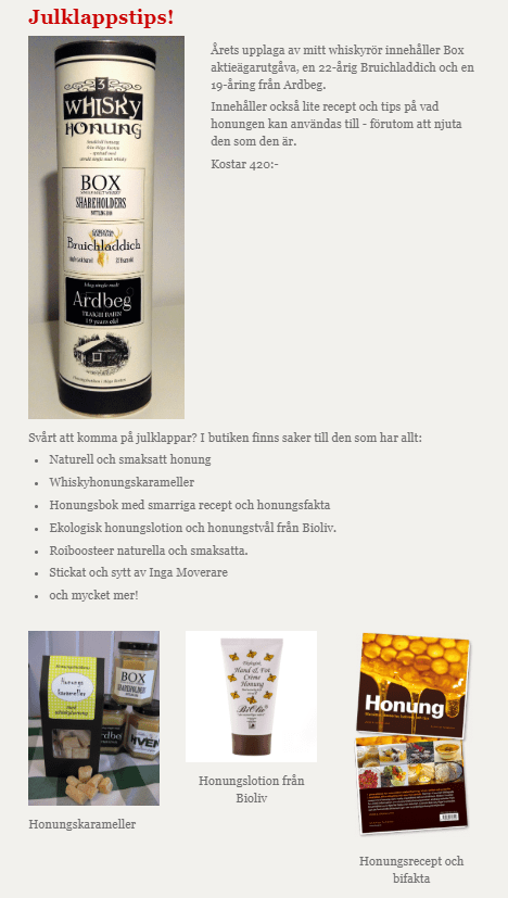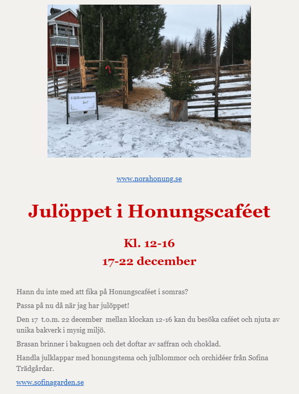 Honungsbutikens julcafé Dela det här: Klicka för att dela på X (Öppnas i ett nytt fönster) X Klicka för att dela på Facebook (Öppnas i ett nytt fönster) Facebook Gilla Laddar in …