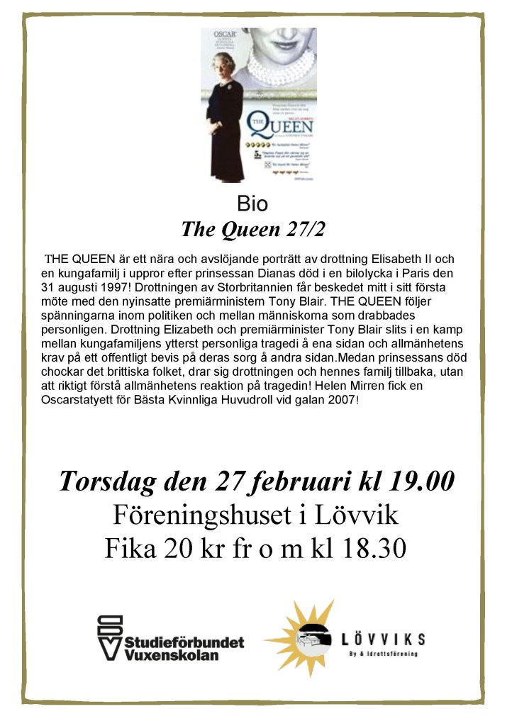 Filmvisning i Lövvik Torsdag den 27 februari kl 19.00 – The Queen Fika 20 kronor fr.om. kl 18.30 Välkomna Dela det här: Klicka för att dela på X (Öppnas i ett nytt fönster) X Klicka för att dela på Facebook (Öppnas i ett nytt fönster) Facebook Gilla Laddar in …