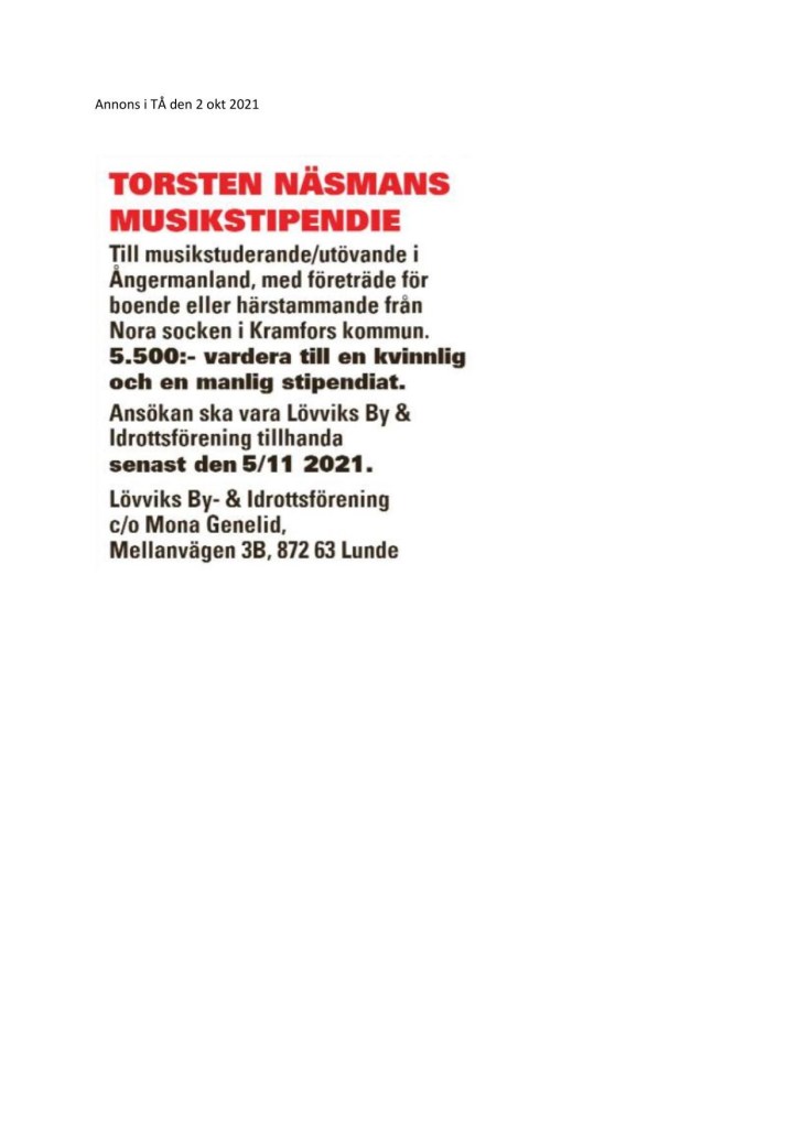 Ansökan till Torsten Näsmans musikstipendium Ansökan ska vara inlämnad senast 5 november 2021, läs annonsen här Dela det här: Dela på X (Öppnas i ett nytt fönster) X Dela på Facebook (Öppnas i ett nytt fönster) Facebook Gilla Laddar in …