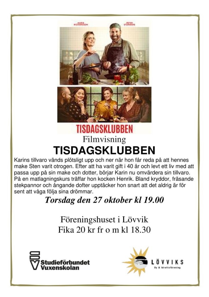 Filmvisning i Lövvik torsdag den 27 oktober- Tisdagsklubben Dela det här: Klicka för att dela på X (Öppnas i ett nytt fönster) X Klicka för att dela på Facebook (Öppnas i ett nytt fönster) Facebook Gilla Laddar in …