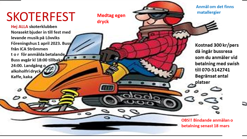 INSTÄLLT! Skoterfest i Lövvik 1 april 18:30 INSTÄLLT! Tyvärr Inställt pga bristande intresse – hoppas vi kan anordna vid senare tillfälle. Dela det här: Klicka för att dela på X (Öppnas i ett nytt fönster) X Klicka för att dela på Facebook (Öppnas i ett nytt fönster) Facebook Gilla Laddar in …