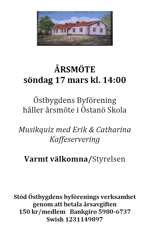 Årsmöte Östbygdens byförening 17/3 Dela det här: Klicka för att dela på X (Öppnas i ett nytt fönster) X Klicka för att dela på Facebook (Öppnas i ett nytt fönster) Facebook Gilla Laddar in …