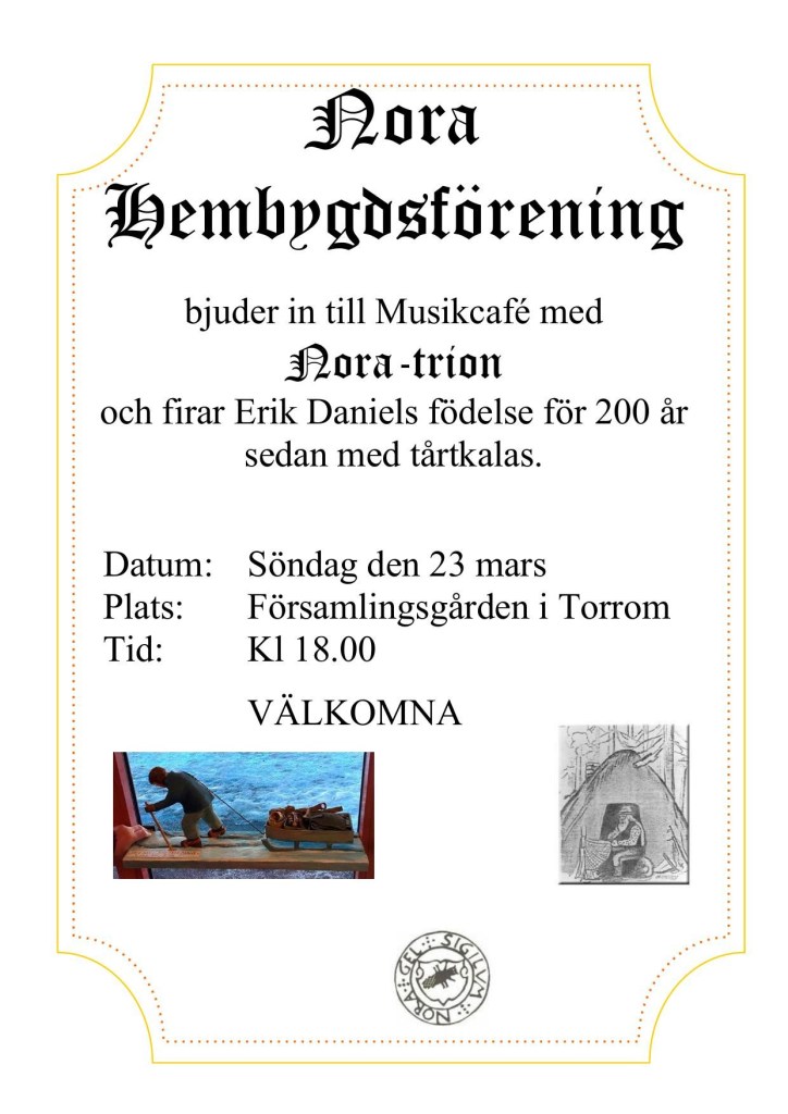 Erik Daniels 200 år – Musikcafé med Noratrion Söndag den 23 mars kl 18.00 Dela det här: Klicka för att dela på X (Öppnas i ett nytt fönster) X Klicka för att dela på Facebook (Öppnas i ett nytt fönster) Facebook Gilla Laddar in …