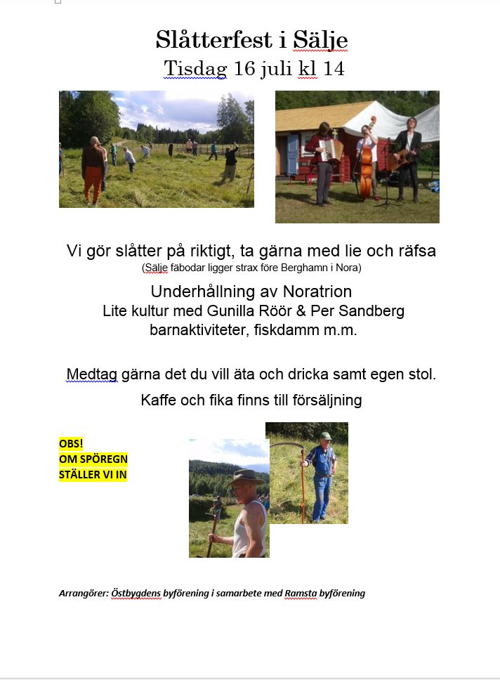 Den 10 juli blev gräset slaget och hässjat i Sälje Det gjordes på gammvise. Liarna kom fram liksom träräfsorna, som brukades av 20 talet Norabor. Totalt hade ett 70 tal anammat inbjudan. Östbygdens Byförening tillika med ”Ramsta böndera ”bjöd in till årets Slåtterfest vid Sälje Fäbodar. Det blev en liten annorlunda upplevelse i år, när gräset mest var gulbrunt och inte alls lika frodigt som det brukar. Solen gassade dock och varmt får det gärna vara när gräset ska torkas.