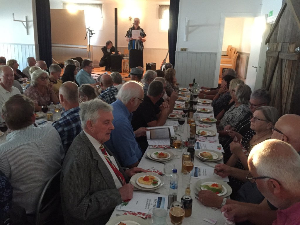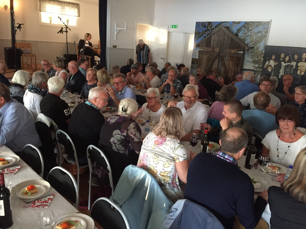 Kvällen inleddes med en tipsrunda med tema Lövviksbron. Det var ganska knepiga frågor som byggde på Tore Ramströms kompendium om Lövviksbrons tillkomst. Carina Ahlenius och Nicke Norberg hade flest rätta svar – 10 av 12 och fick delat 1:a pris. Sedan var det dags att bänka sig vid borden för att äta en trerätters meny som lagats av KAMOKE AB, dvs Karin Saltin; Monica Lindquist, Kerstin Lif och Ann-Britt Wallin. Deras respektive stod för servering och fanns till hands för olika arbetsuppgifter. Menyn bestod av västerbottenspaj med tångkaviar, höstgryta med potatis och sallad, dajmglass till efterrätt. Under kvällens gång sjöngs Ledins sång ”I sjöbodarnas vik” som han diktade till Invigningsfesten för Lövviksbron 1999.