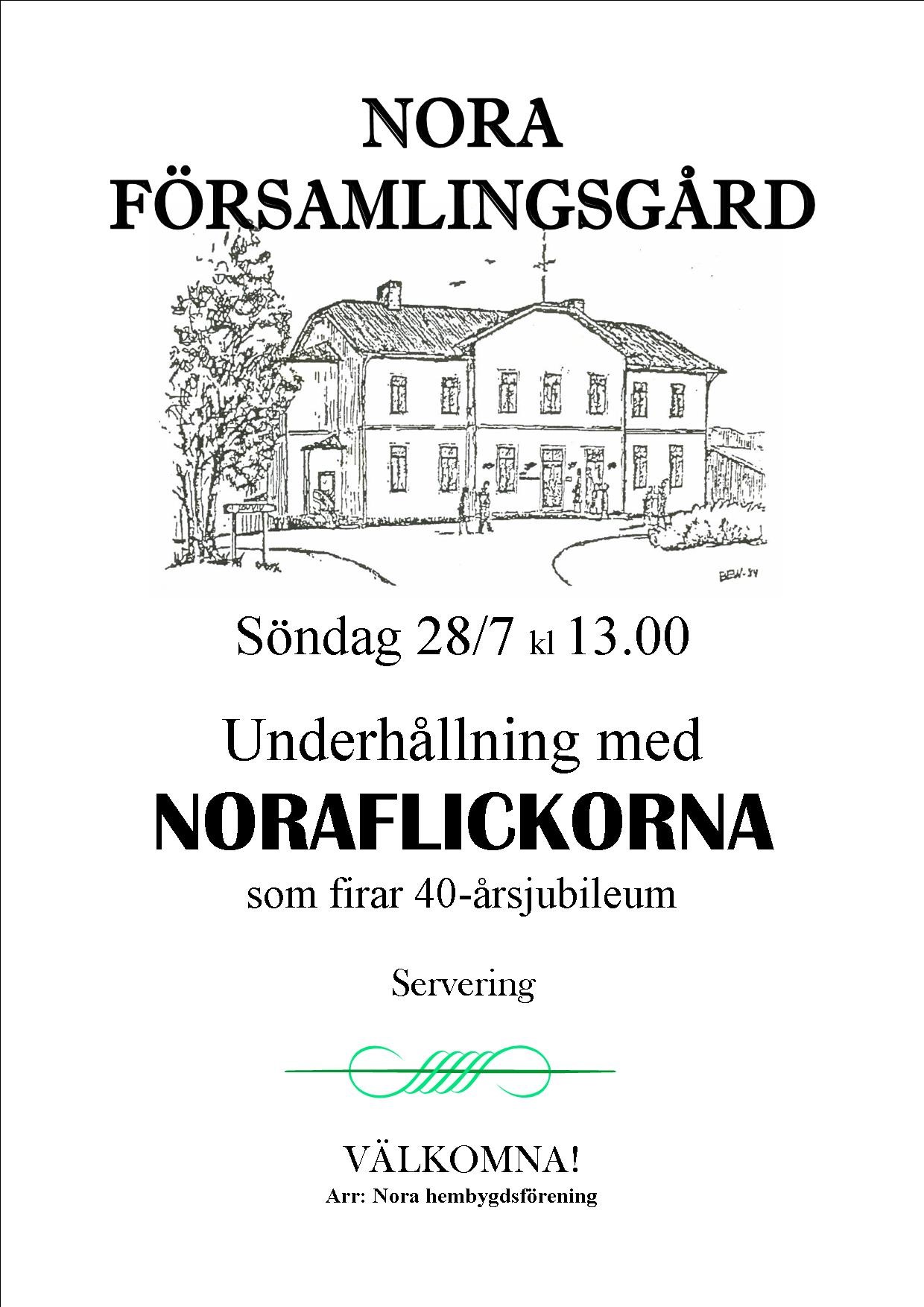 30/6 13:00 NORA-dagarna. Utdelning av Norastipendiet. Hela Nora bakar – hembakat, servering, lotteri. Musik: Sara Öhlen & Pelle Nordlander Lokal ”MiniMarknad”. Hönsgård.